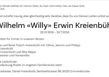 In stiller Trauer gedenken wir Wilhelm «Willy» Erwin Kreienbühl.